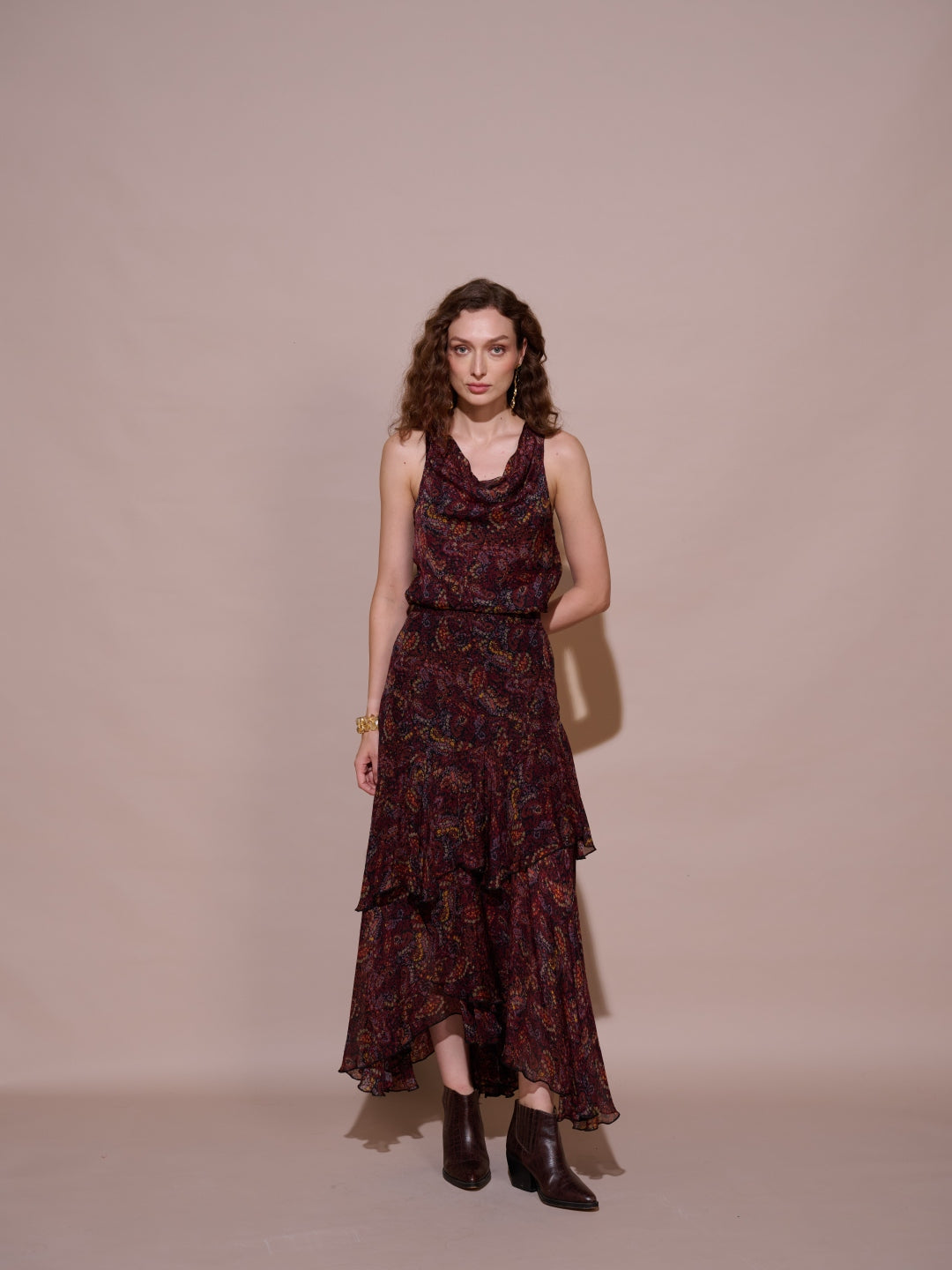 The Sharon Cowl Neck Top features a chic cowl neck design in an elegant print. Paired with a matching Sharon Ruffle Skirt, it transitions effortlessly from day to night, offering a stylish and versatile option for day outings.